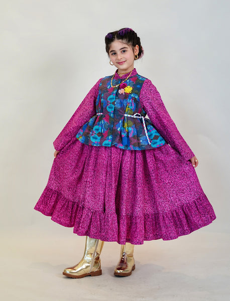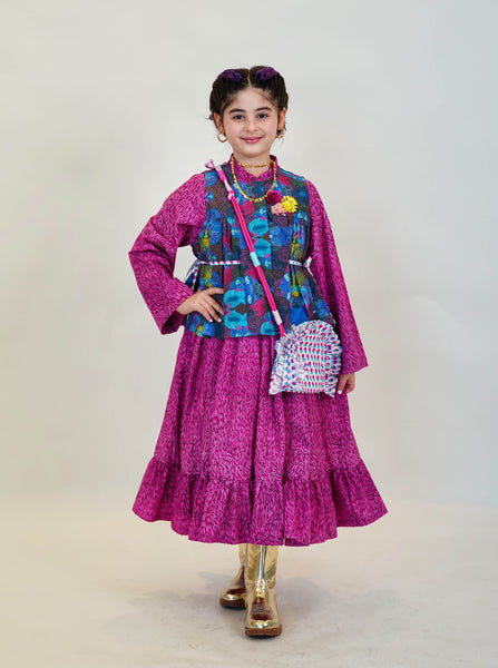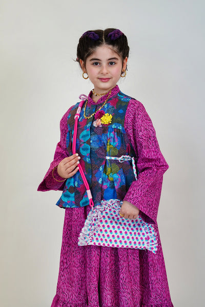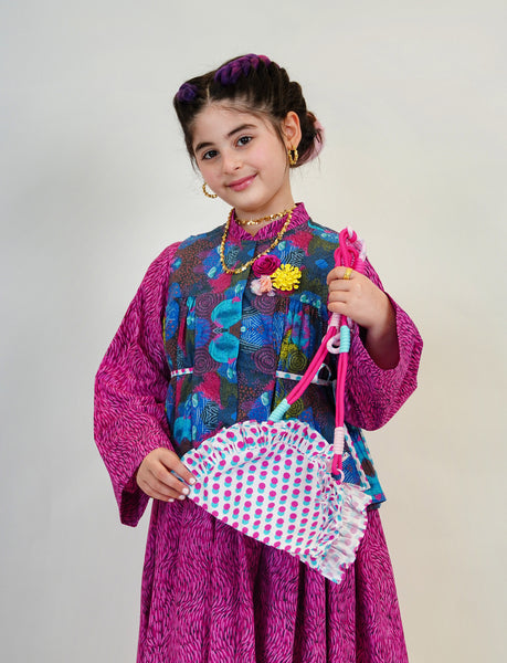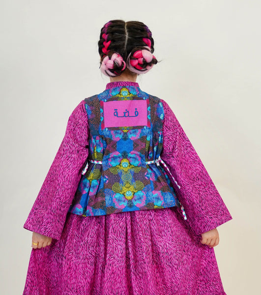 Unique Dress, Vest and Purse in an exclusive artistic fabric design with an option to add your daughter's name on the back of the Vest.